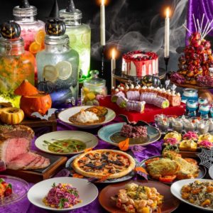 入り口を入ってまず目を引くのは、ハロウィーン雰囲気たっぷりの食台に盛り付けられたスーツ達。一つ一つ、手の込んだハロウィーン模様が施されています。