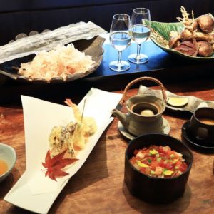 写真左から時計回りに、南瓜ムースとビーフパストラミ、茄子のカクテル 柿ソース、生ハム、豆アジときのこのマリネ。