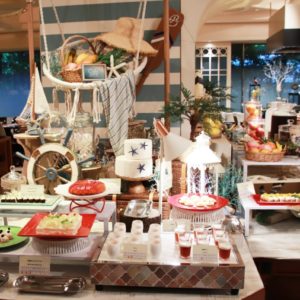 通常の朝食メニュー、チョコレートファウンテンを含めたお子様ランチメニュー10種類に加えて、具材ごろごろローストビーフと夏野菜のチョップドサラダ、恐竜ナゲット、デザートにはバケツプリンと盛りだくさんの朝食をご用意しております。