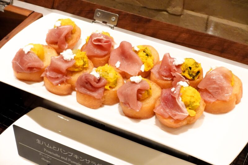 「生ハムとパンプキンサラダ」のブルスケッタは、生ハムの塩味と、パンプキンの甘みがコントラストを奏でています。