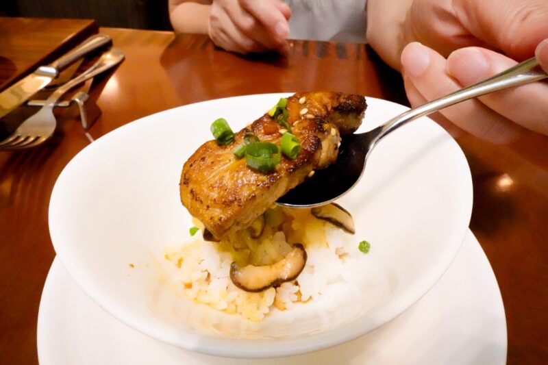 白身魚をパン粉で焼いているようで、香ばしい焼き目がついています。ジンジャーソースがパン粉によく絡み、旨みを引き出しています。