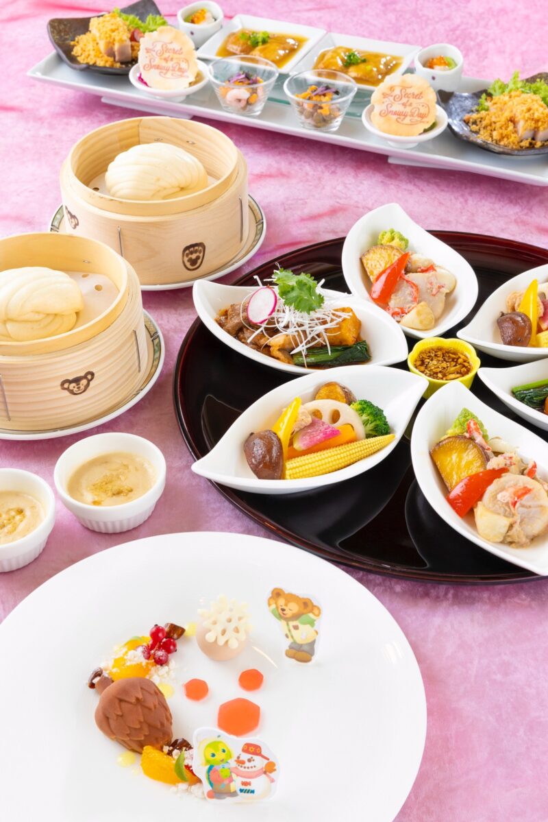 前菜や中国蒸しパン、メイン料理に加えて、ダッフィー&フレンズや雪だるまのモチーフがあしらわれたデザートをお楽しみいただけます。