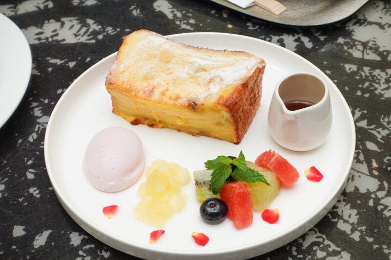 系列ホテル「浅草ビューホテル」のお膝元、浅草の食文化である、さつまいもの甘露煮を生地に加えて焼き上げたフレンチトーストです。しっとりとしたトーストを、リンゴのコンポートとほんのり香るローズを感じながら召し上がってください。