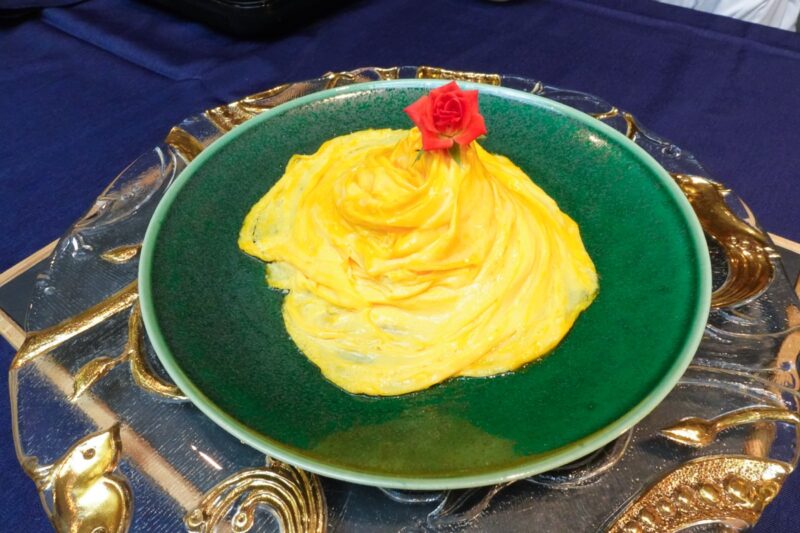 「ドレス・ド・オムレツ」は、人気のシグネチャーメニューです。「地養卵」を使用して、シェフが匠の技で鮮やかな黄色いドレスに仕立て上げた一品です。トップには赤いバラが添えられ、まさにおとぎ話の世界です。
