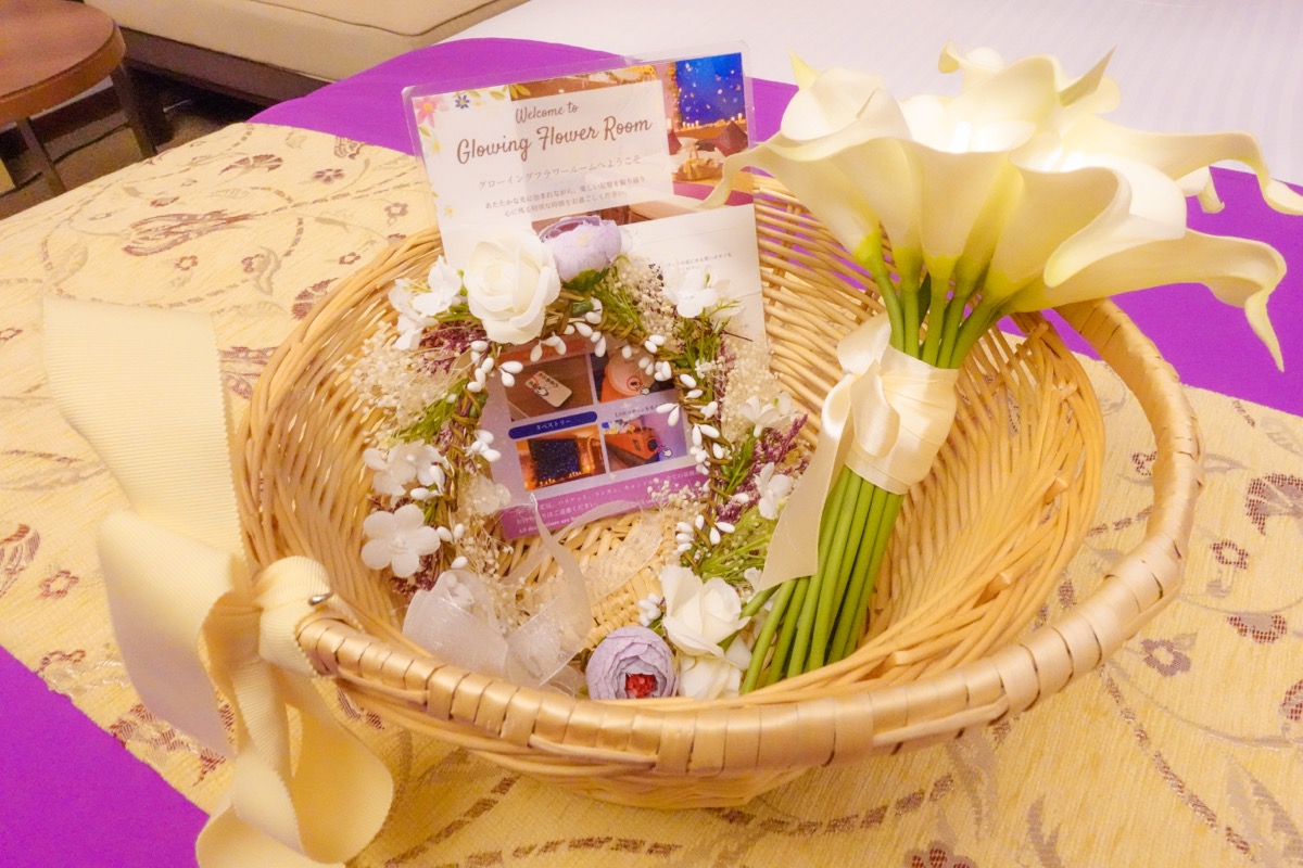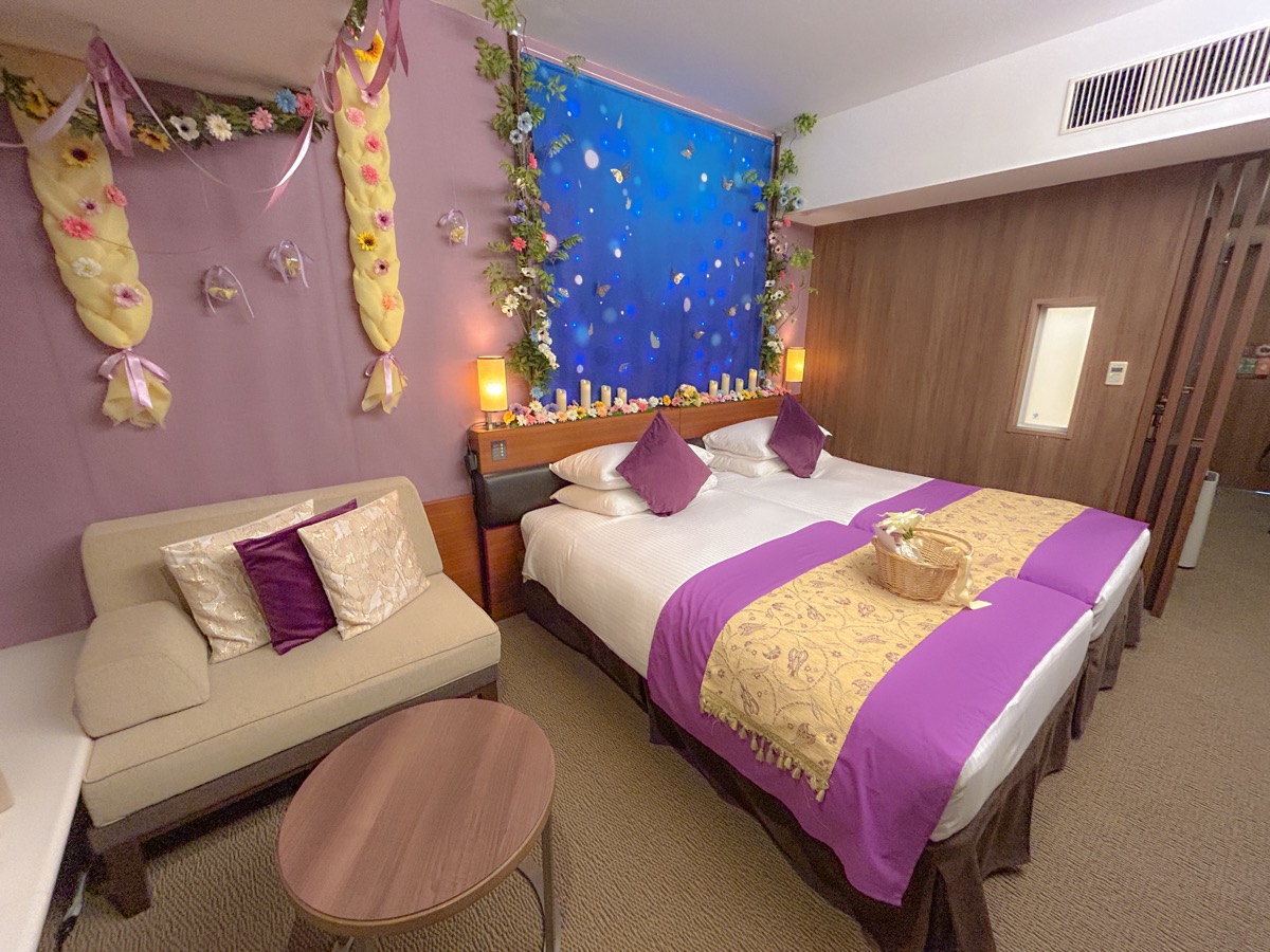 鮮やかな紫を基調とした、お花に囲まれた客室です。