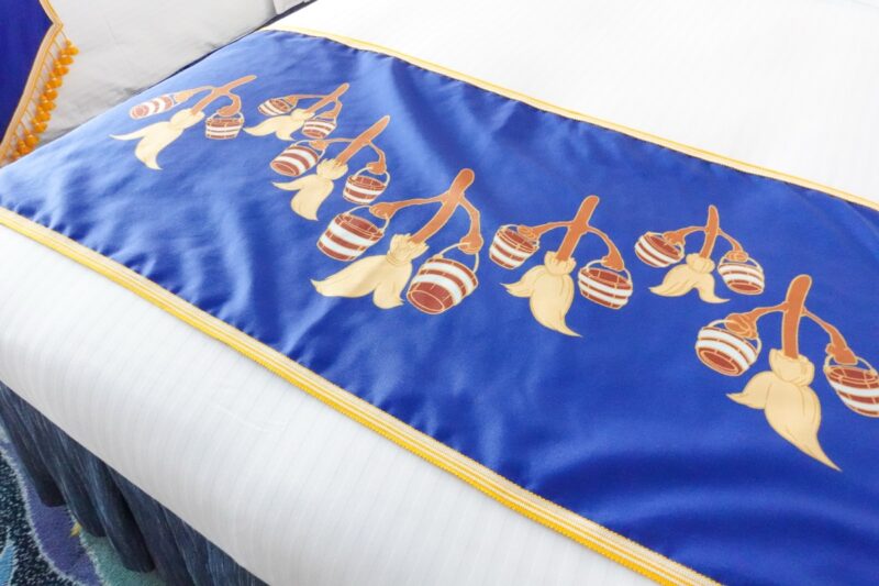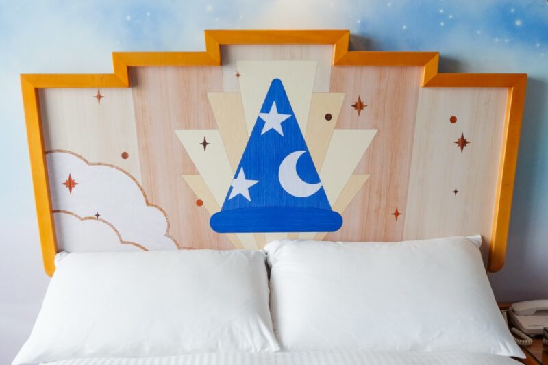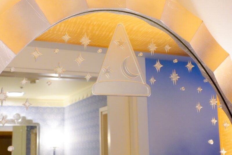 壁には映画に登場するローブ姿のミッキーマウスが描かれていて、ランプシェードには月と星のモチーフがあしらわれた魔法使いの帽子がデザインされています。