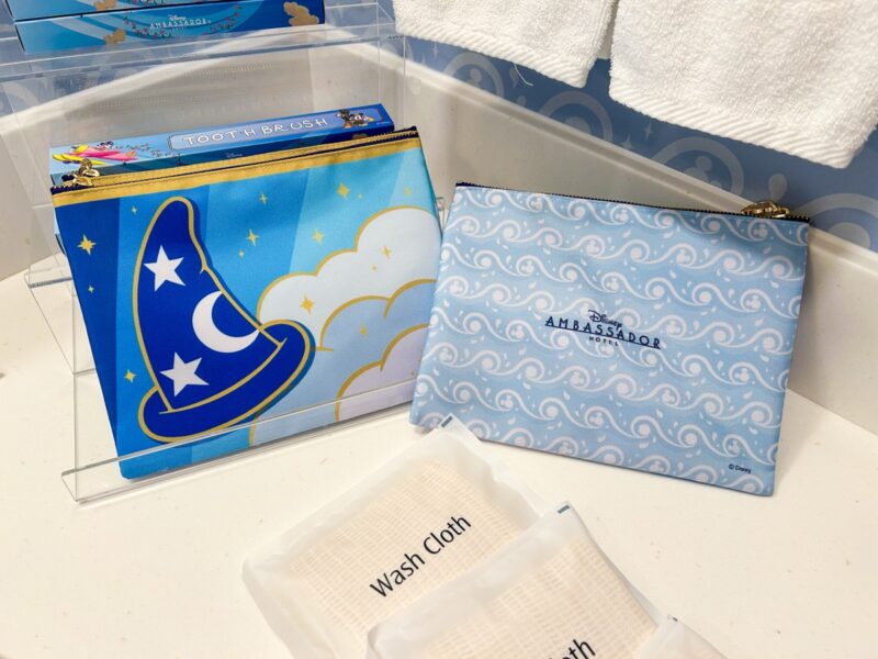 洗面所には、持ち帰ることができる、オリジナルポーチが置かれていました。