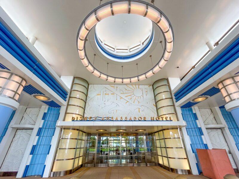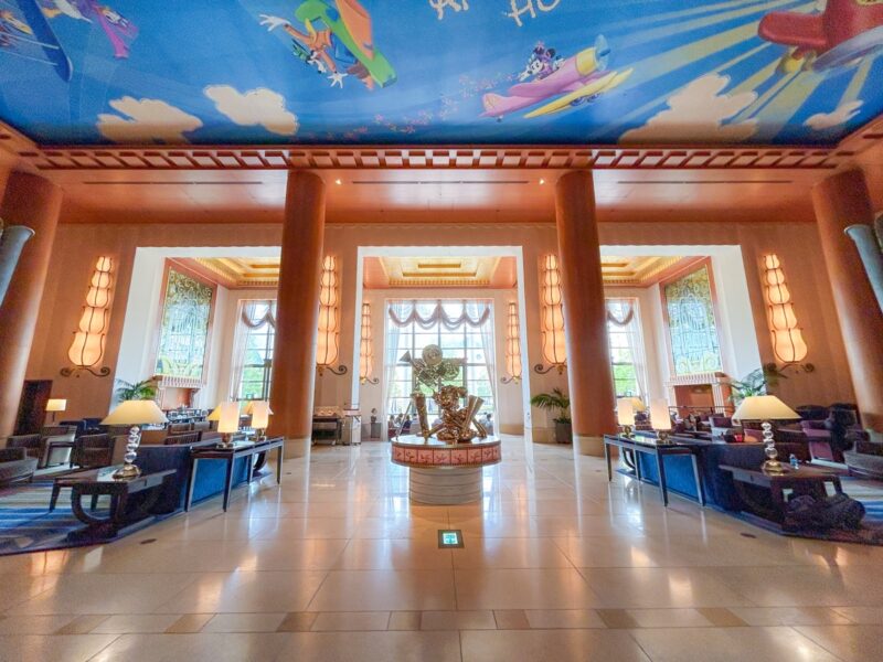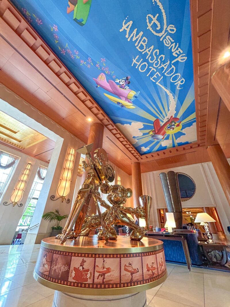 ホテルのメインロビーの吹き抜け天井には、ディズニーアンバサダーホテルの歴史的舞台である1930 年代の飛行機を操縦するディズニーの仲間たちを描いた天井画があります。