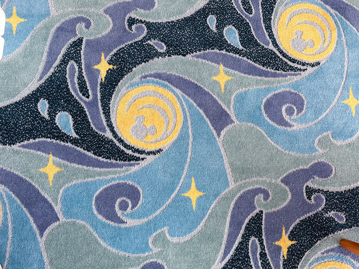 カーペットに、流れる水がデザインされています。これは、ミッキーの未熟な魔法によって、水浸しになってしまったお部屋をイメージしています。