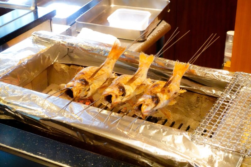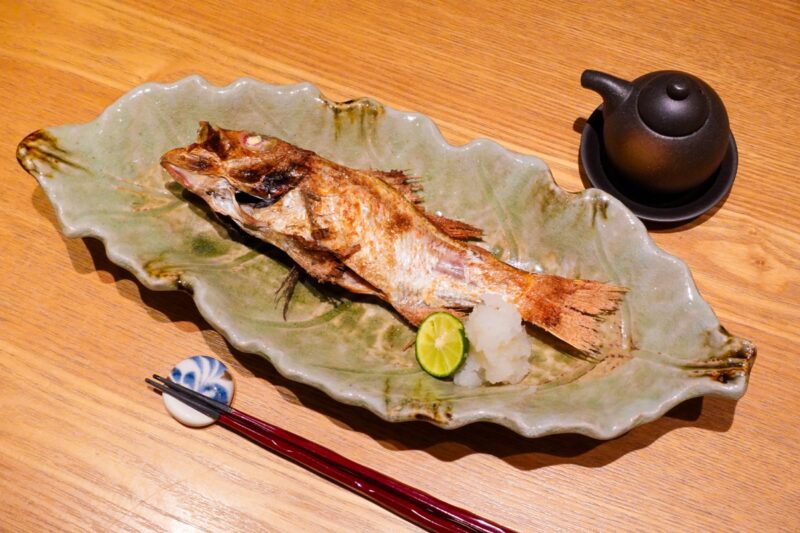 サイドメニューのおすすめから、「のどぐろの塩焼き」をご紹介します。カウンターに設置されたオープンキッチンで、じっくりと炭火焼きしたものが提供されます。