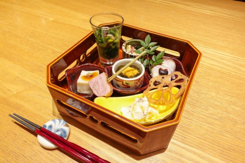 八寸とは、茶懐石料理の言葉で、八寸(約24cm)四方の、杉のへぎ木地の角盆に盛り付けられた料理のことをいいます。