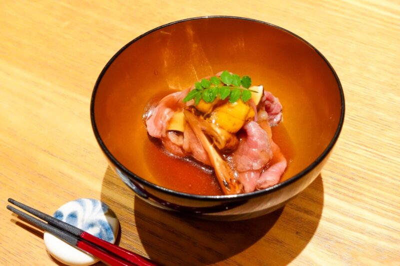 鯛の骨を6時間煮込み、昆布・しいたけ・かつお・うるめ・さばの五種の出汁となる素材を入れ、旨味を凝縮したそうです。驚くほど澄んでいて、すごくさっぱりとしているのに、旨み成分の塊のような味です。決して、塩気が強いわけではないのに、味わいが濃厚。贅沢とはこの事かと思います。