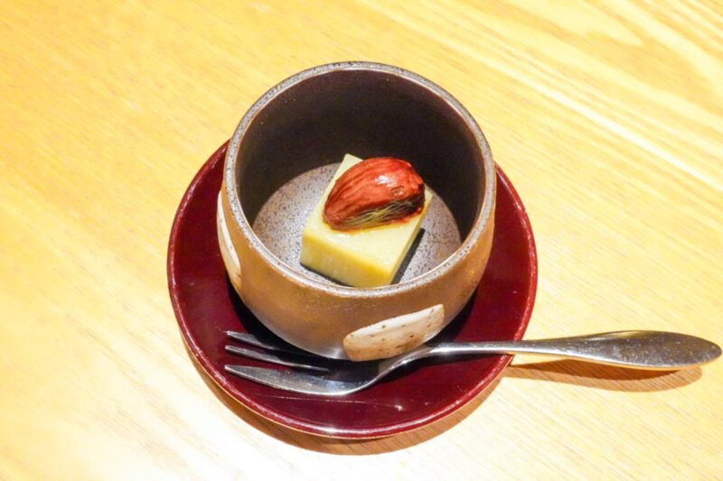 この日のデザートは、さつまいもの羊羹と栗の甘煮でした。この羊羹、甘過ぎず水分が多めで、食事の後に負担にならない上品な味わいでした。栗の甘煮も甘過ぎず、ホクホクとした栗の食感を楽しむことができます。
