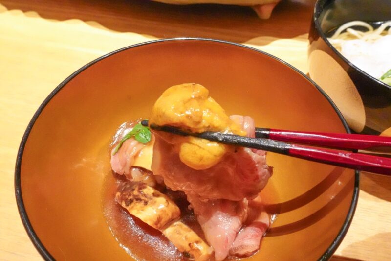 そこに、卵ではなく、生うにを添えて食べることになります。生うにのとろとろの食感と相まって、濃厚かつ贅沢するぎる味になっています。
