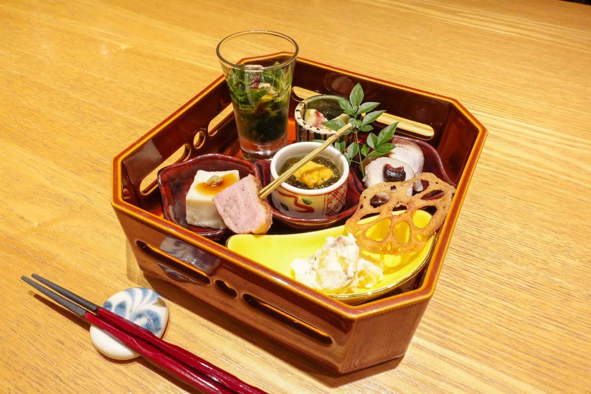 炙り鯖寿司、法蓮草と椎茸のお浸し、柿とさつま芋の白和え、蓮根煎餅、無花果胡麻酢ジュレ掛け、本日の三品、となっています。