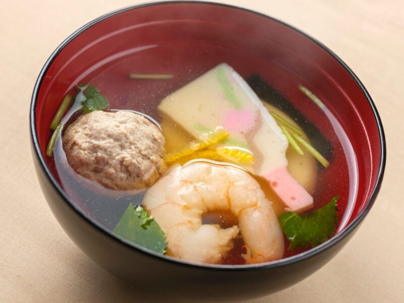 どちらのお店でもお食事のセットになっている味噌汁を雑煮椀に変更することができます。雑煮椀は丸餅や海老、羽子板の形をしたかまぼこが入った、見た目でもお正月らしさを感じられるメニューです。