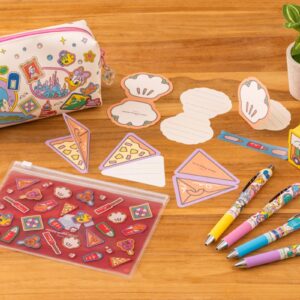 餅つきを楽しんでいる和装姿のミッキーマウスやミニーマウス、ドナルドダック、ホーレス・ホースカラーが描かれたきんちゃくやポストカードは、赤や白、金色を基調にした色合いで日本のお正月らしさを感じることができます。