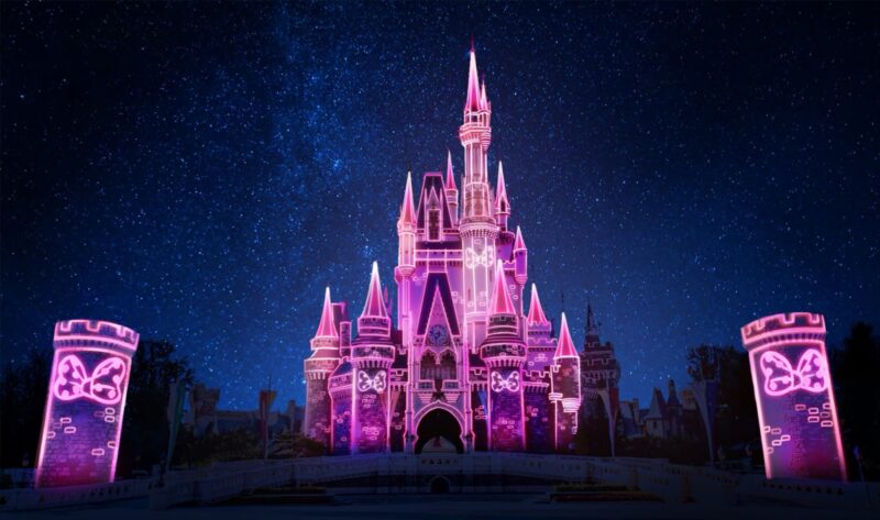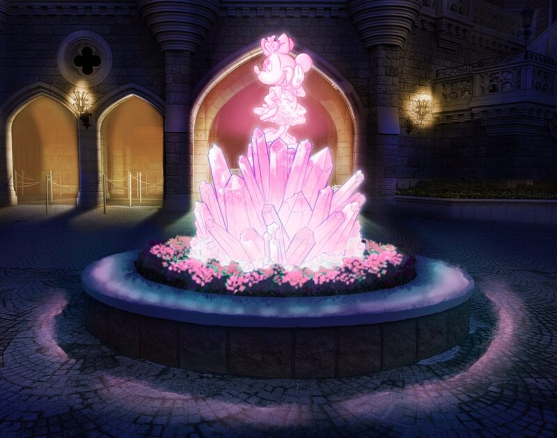 新たに実施する「ファンダーナイト」では、ポップな音楽にのせてシンデレラ城にプロジェクションマッピングでリボンやハートなどミニーらしいモチーフが映し出されるほか、シンデレラ城前のプラザにあるランプポストの上部がハート型のステンドグラス仕様になる等、辺りをピンク色に照らすデコレーションで夜もミニーの世界に染まります。