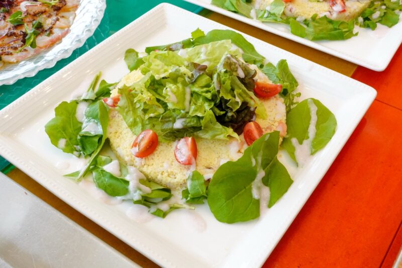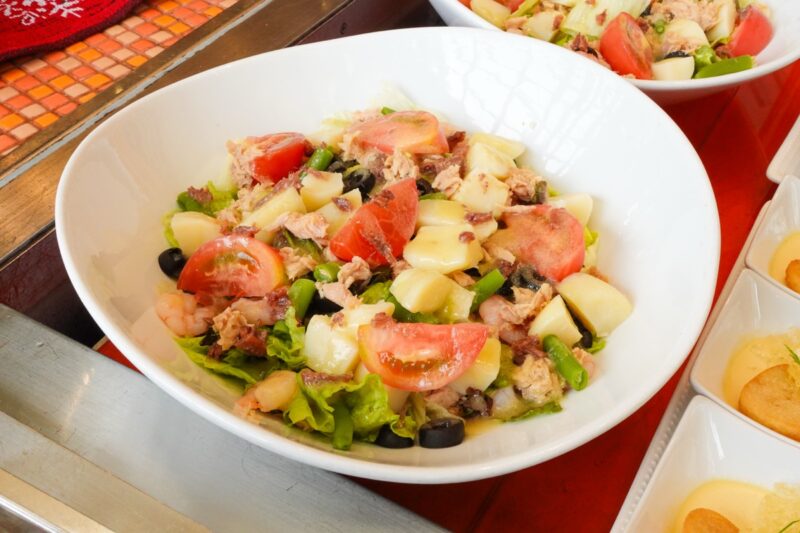 南仏コート・ダジュール地方の都市ニースに由来する「ニース風」のサラダです。トマト、ツナ、小エビ、オリーブ、インゲン、ジャガイモなどの具材をオリーブオイルとヴィネガーのソースで和えています。