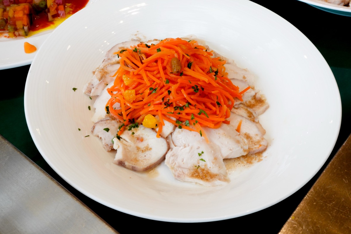 鶏むね肉とささ身を4種のスパイス「キャトルエピス」で香り豊かにマリネし、さっぱりとした人参サラダ「キャロットラペ」を添えたフレンチ風の一皿です。