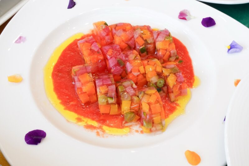 ラタトゥイユのアスピックは、南仏の野菜煮込み「ラタトゥイユ」をコンソメなどのゼラチンで固め、冷製のゼリー寄せに仕立てた料理です。鮮やかな彩りが、クリスマスにぴったりの一品です。