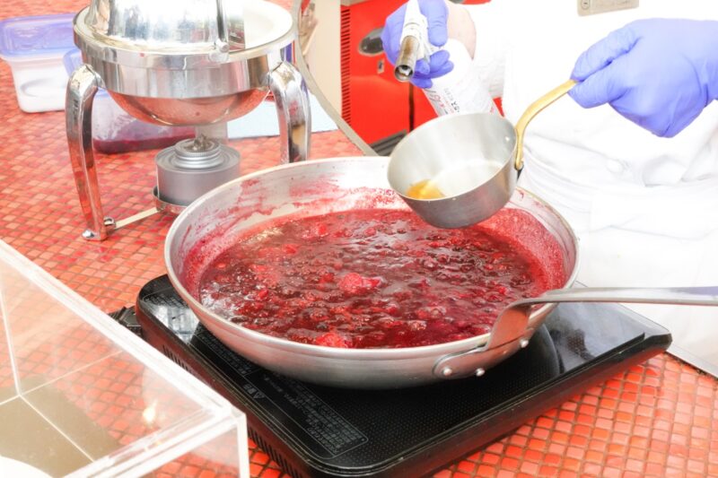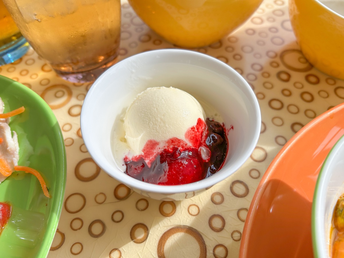 その場でフランベしたソースを冷たいアイスクリームにかけて提供されています。フルーツの甘みが引き立ち、香ばしい香りが漂います。