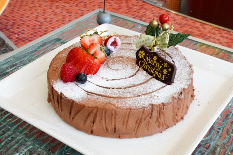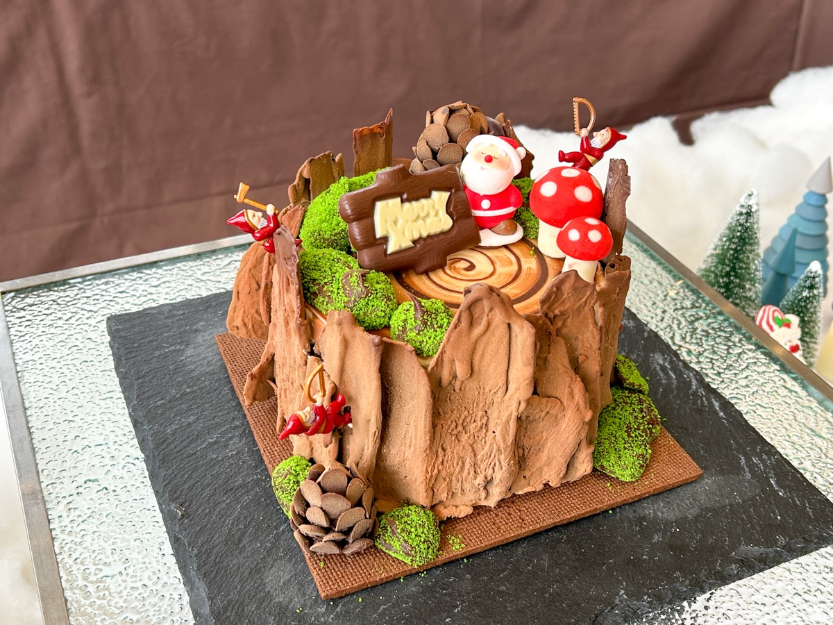 こちらも、クリスマス定番のブッシュドノエルです。ロールケーキではなく、切り株型が特徴。たっぷりのチョコレートクリームを楽しむ事ができます。