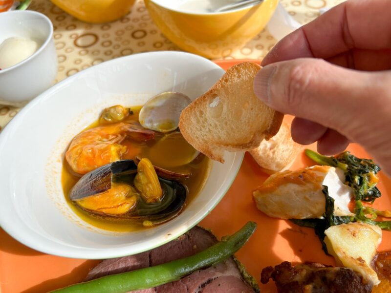 ルイユ(ニンニクと唐辛子を効かせたマヨネーズ風ソース)やバケットも用意されていて、スープに浸して食べると、2度美味しいです。