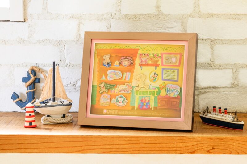 そして、部屋に飾ればいつでもパークでの思い出を重ねることができる、過去の代表的なアートをモチーフにしたピンバッジセットも登場します。台紙にはダッフィーの部屋をイメージしたアートが描かれています。