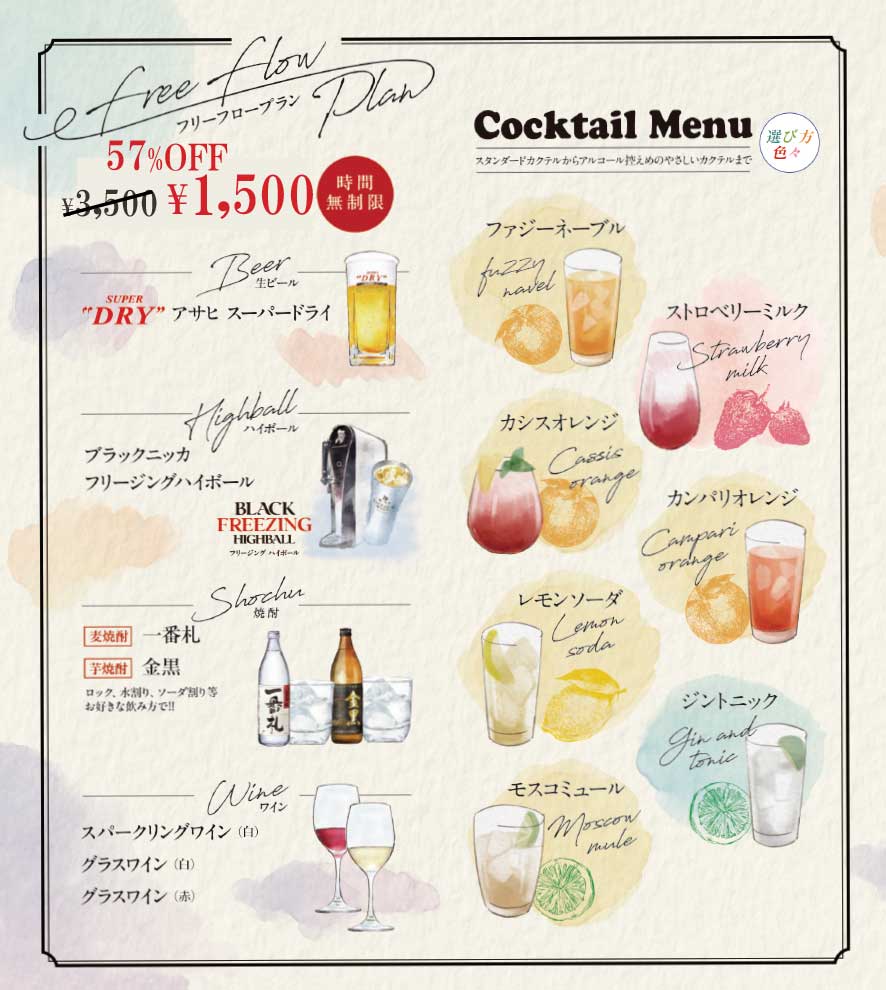 料金:飲み放題1,500円 (通常料金3,500円のところ)