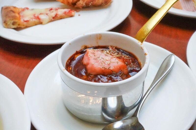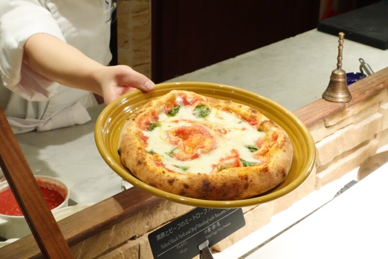 こちらも定番料理のカシュカシュ風マルゲリータです。その場で作り、ピザ窯で焼き上げていますので、焼きたてが提供されています。