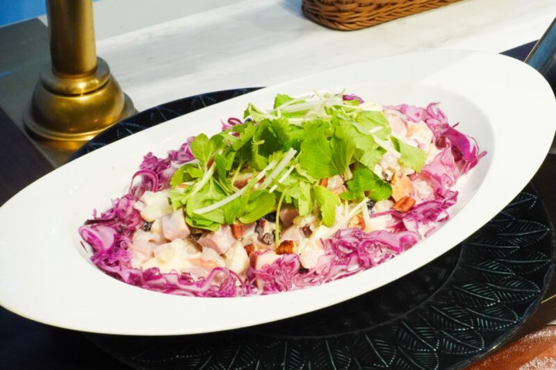 「鴨肉と赤キャベツのワルドフ風サラダ」はニューヨークのホテルが発祥と言われるサラダです。鴨肉と赤キャベツにリンゴとナッツのマヨネーズ系ソースを合わせた、豊かな食感と彩りが楽しめる一皿です。