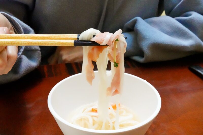 さっぱりとしたライスヌードルは、帆立、鶏、野菜の旨味を丁寧に重ねたスープが魅力です。アクセントに生姜が効いてて、冬の寒い季節にほっこりとするシメの一品です。