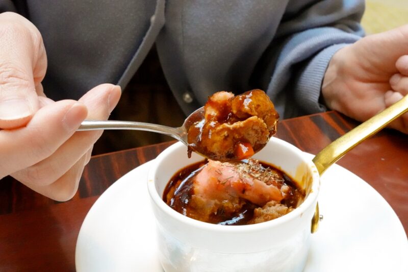 「黒豚とビーフのミートローフ バルサミコ風味」がオーブンで焼き上がると、ベルが鳴ります。焼きたて熱々を召し上がってみてください。