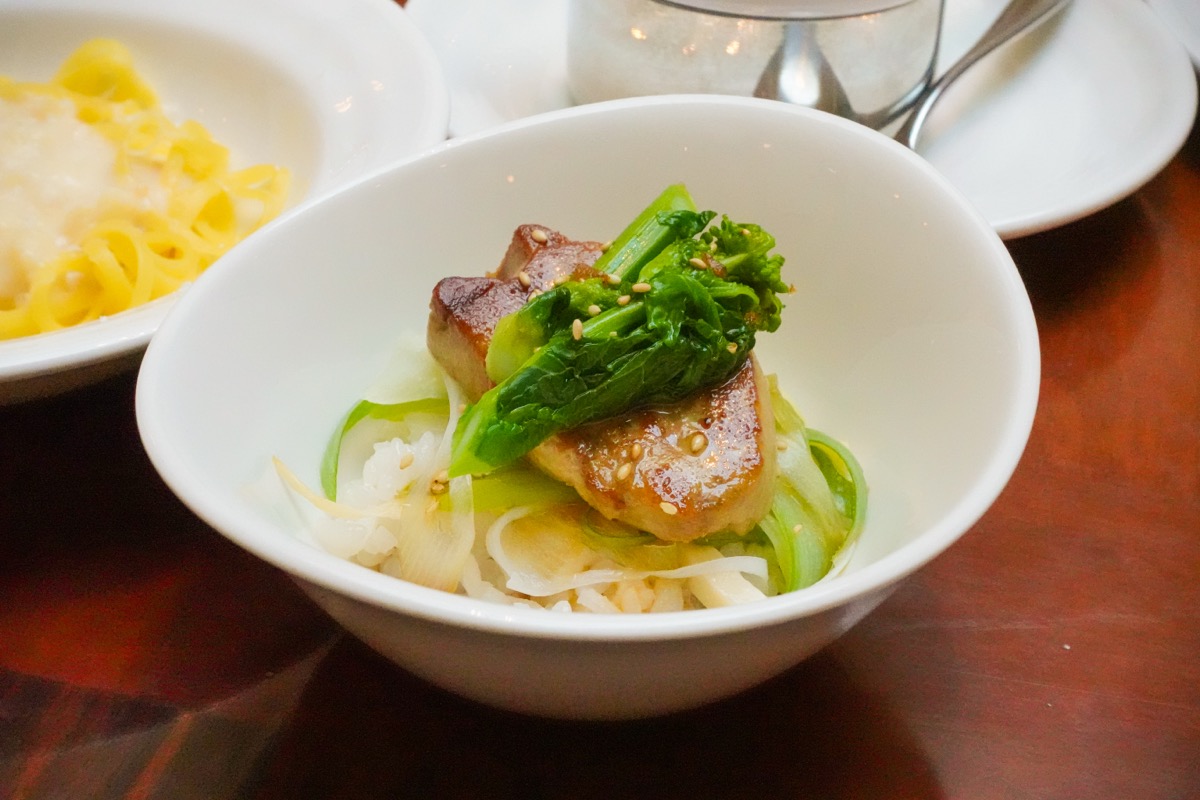 香ばしく焼き上げられたフォアグラは、噛むとトロリと解ける食感で、濃厚な味が口いっぱいに広がります。そして、絶品なのは、ニンニク入りの和風ダレ。ホテルのオープン時から継承されるレシピで作られているそうで、フォアグラの旨みを100%引き立てます。