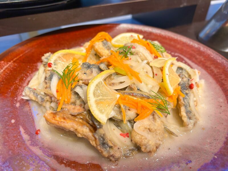編集部推しのメニューをご紹介します。まず、イワシのカルピオーネ。北イタリアのマリネ料理だそうですが、イワシを揚げた香ばしさと、酢やハーブによる甘酸っぱさが両立していて、さっぱりと召し上がれる料理です。これは白ワインと一緒にいただきたくなります。