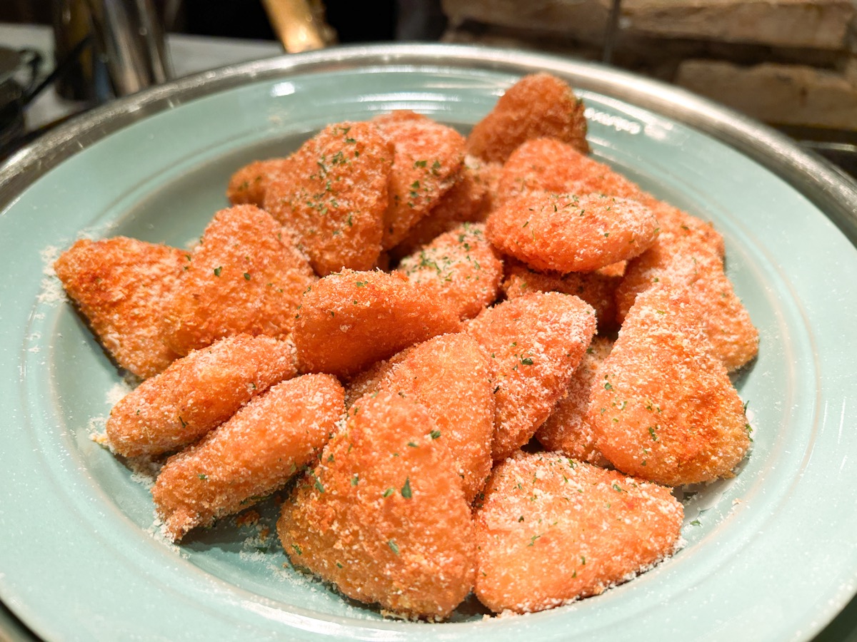 こちらもシンプルな料理ですが、サクッと揚げられたフライの中に、とろりとチーズが入っていて、サクサクとトロリの両方が味わえ、食べると止まらなくなる一品です。