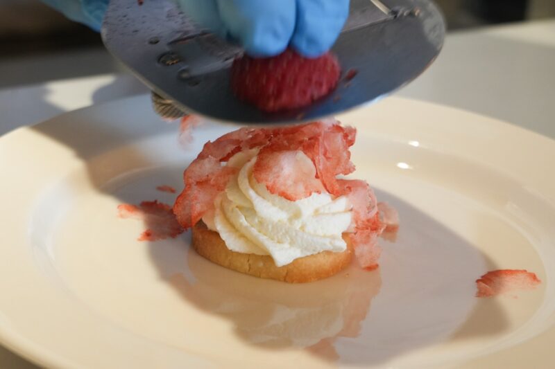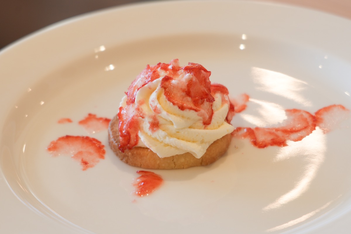 クッキー生地の上に、マスカルポーネと生クリームを合わせたクリームを絞り、その上に、お好みのフローズンフルーツをスライスしてのせます。