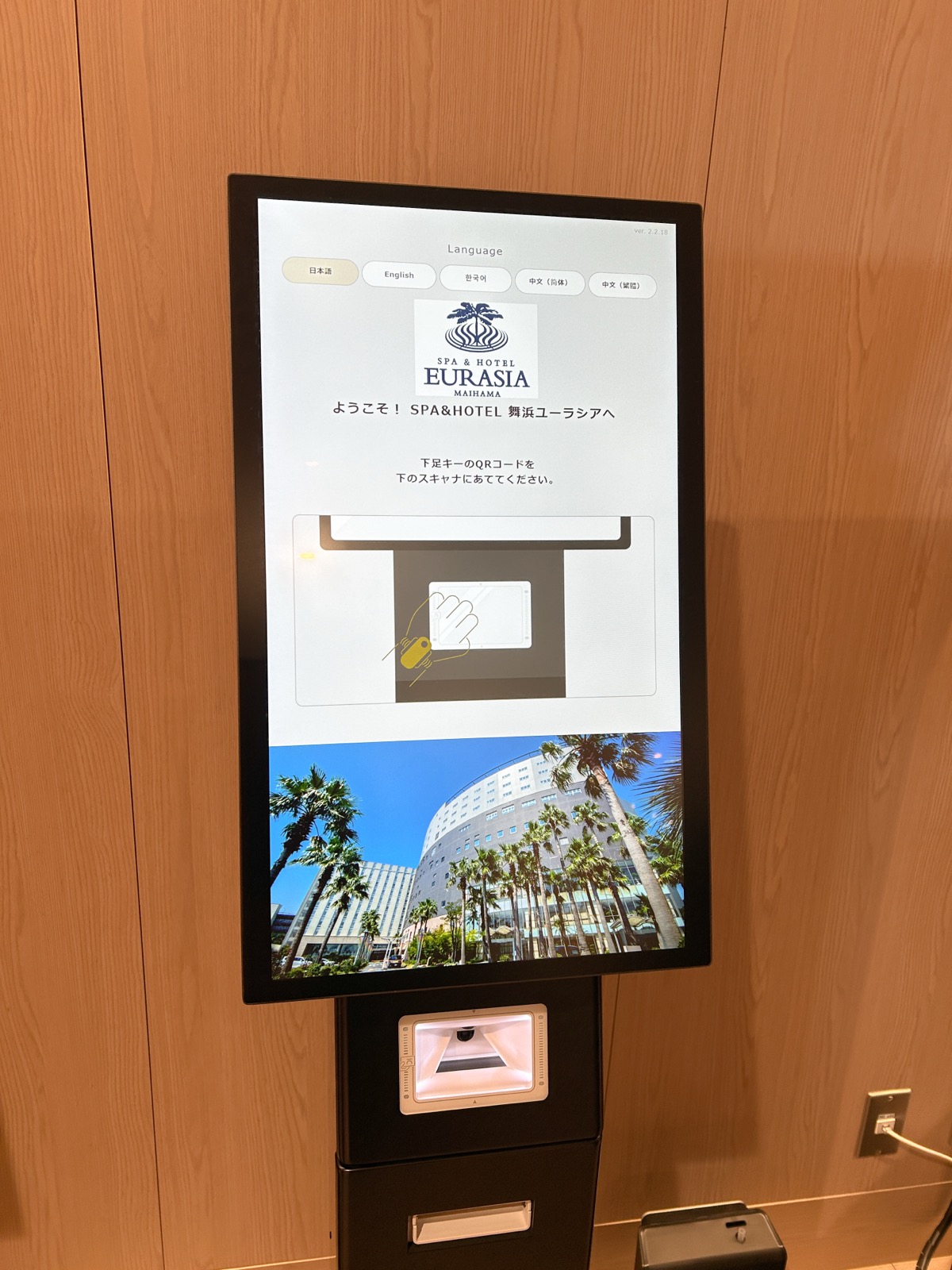 チェックインは、自動機を使うので、スムーズです。リストバンドについているQRコードをかざして使います。