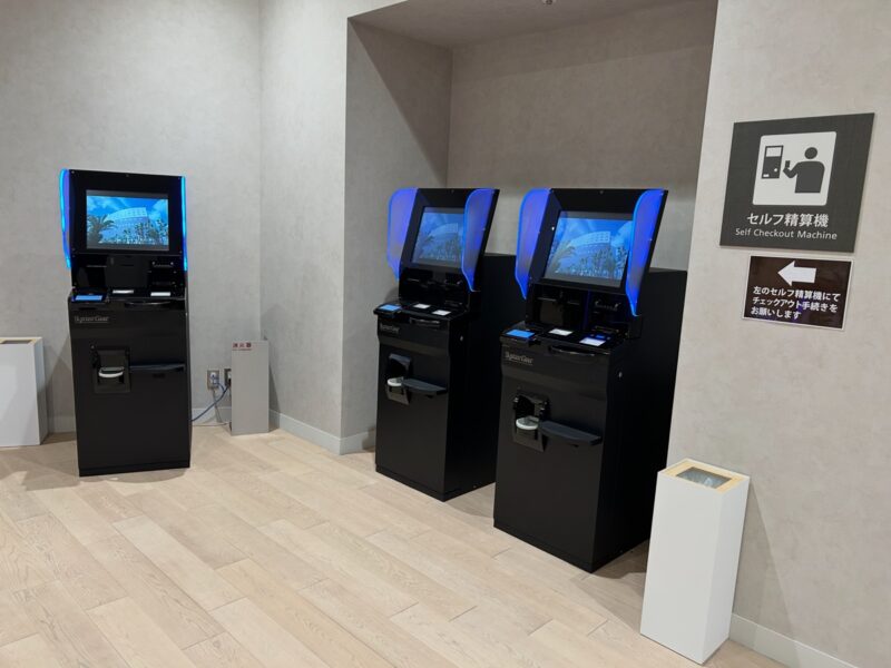 お帰りは、3階のエントランスへ戻ります。ここでもリストバンドのQRコードを使った自動精算機が設置されていて、スムーズにチェックアウトすることができます。