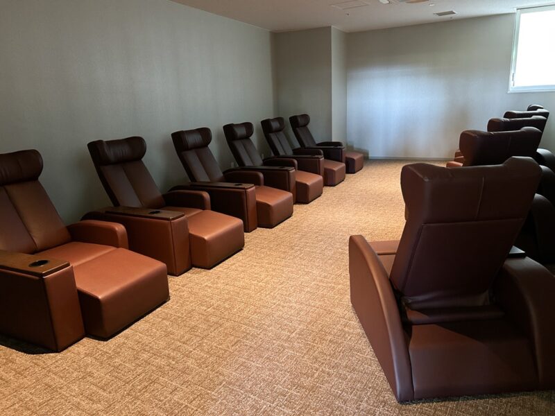 男女共用と女性専用の2種類が用意されています。リクライニングチェアが並ぶ、静かな休息の間です。照明も落とされており、深い眠りにつくことも可能です。
