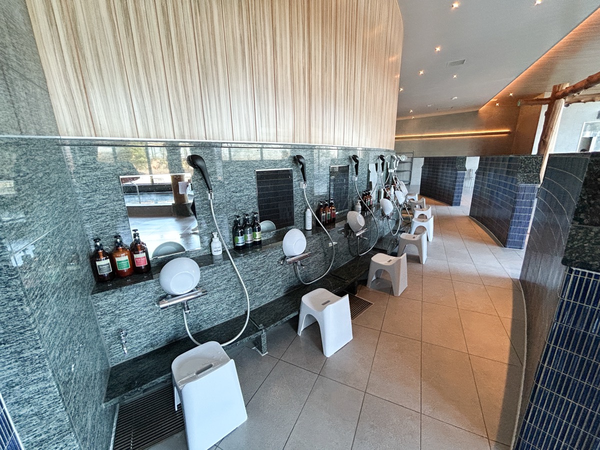 洗い場も広々としていて、座り心地の良い凹凸のある椅子や、ボディーソープ、シャンプー、コンディショナーなどが完備されています。