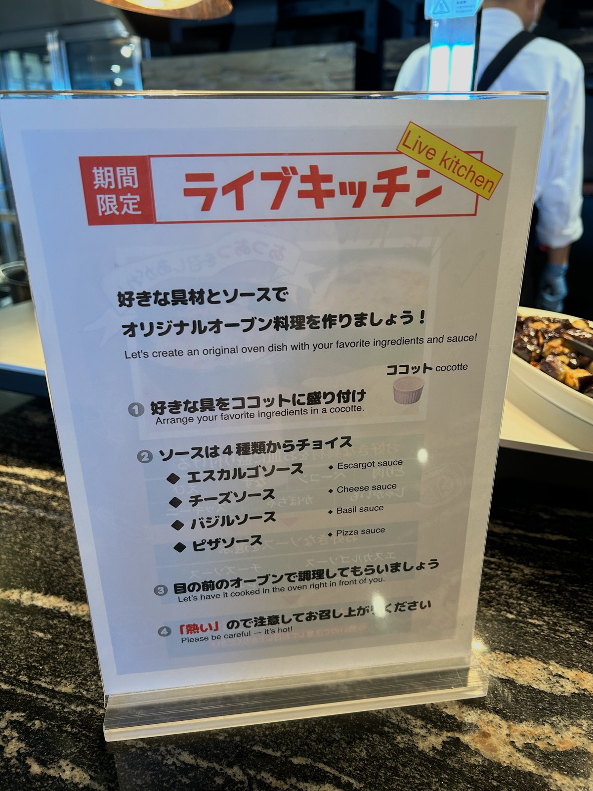 同じ石窯では、オリジナルのオーブン料理を作ることができます。好みの具材をココットに入れてシェフにお願いすると、石窯で熱々に焼き上げてくれます。