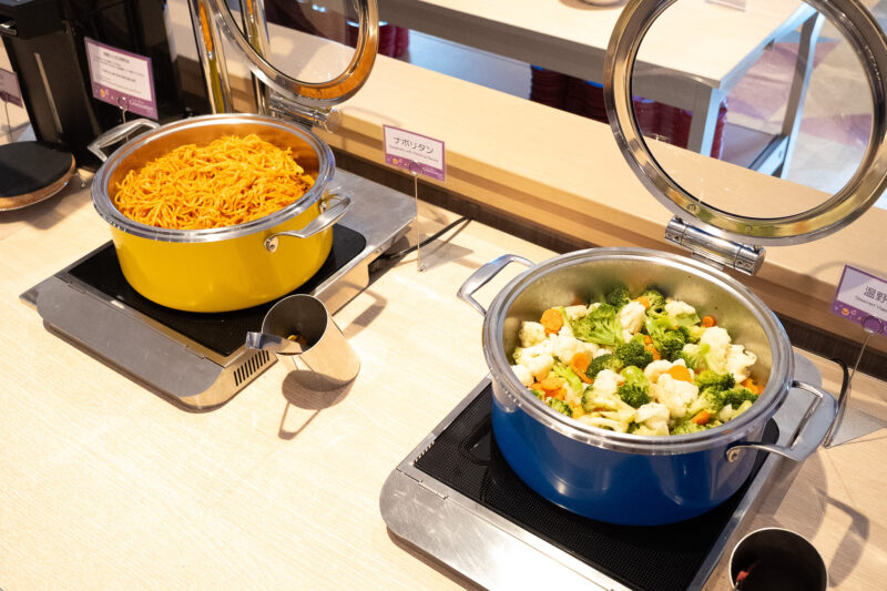 多彩なブッフェ:お好きな料理や飲み物をブッフェカウンターから自由に選んで楽しめます 。