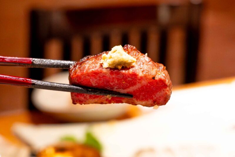 あわせて提供される「和牛サーロイン」は、本わさびと共に。炭火の遠赤外線効果で、肉の旨味がしっかりと閉じ込められています。