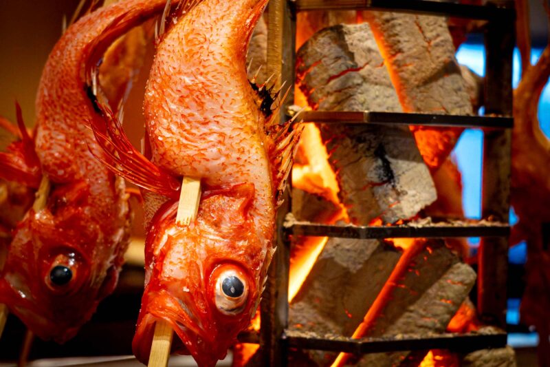 コースの真骨頂、原始焼きが登場します。 「きんきの塩焼き」は、脂の乗った身が驚くほどふっくらしており、皮目はカリカリに香ばしく焼き上げられています。魚には、肝・カツオだし・梅・お酒を煮詰めたものに大根おろしをあえたソースを合わせるのが通な楽しみ方です。
