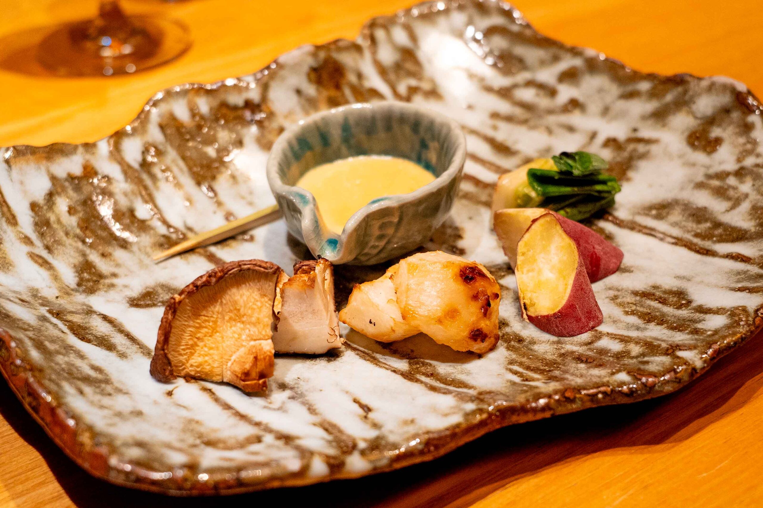 新潟県産八色椎茸をはじめ、葉玉ねぎ、さつまいも、かぶといった冬の野菜を炭火で焼き上げています。 これらを「酒盗、クリームチーズ、ゆず味噌」を合わせた特製ソースにディップして味わうスタイルは、炭火の香ばしさと濃厚なソースが絶妙にマッチします。