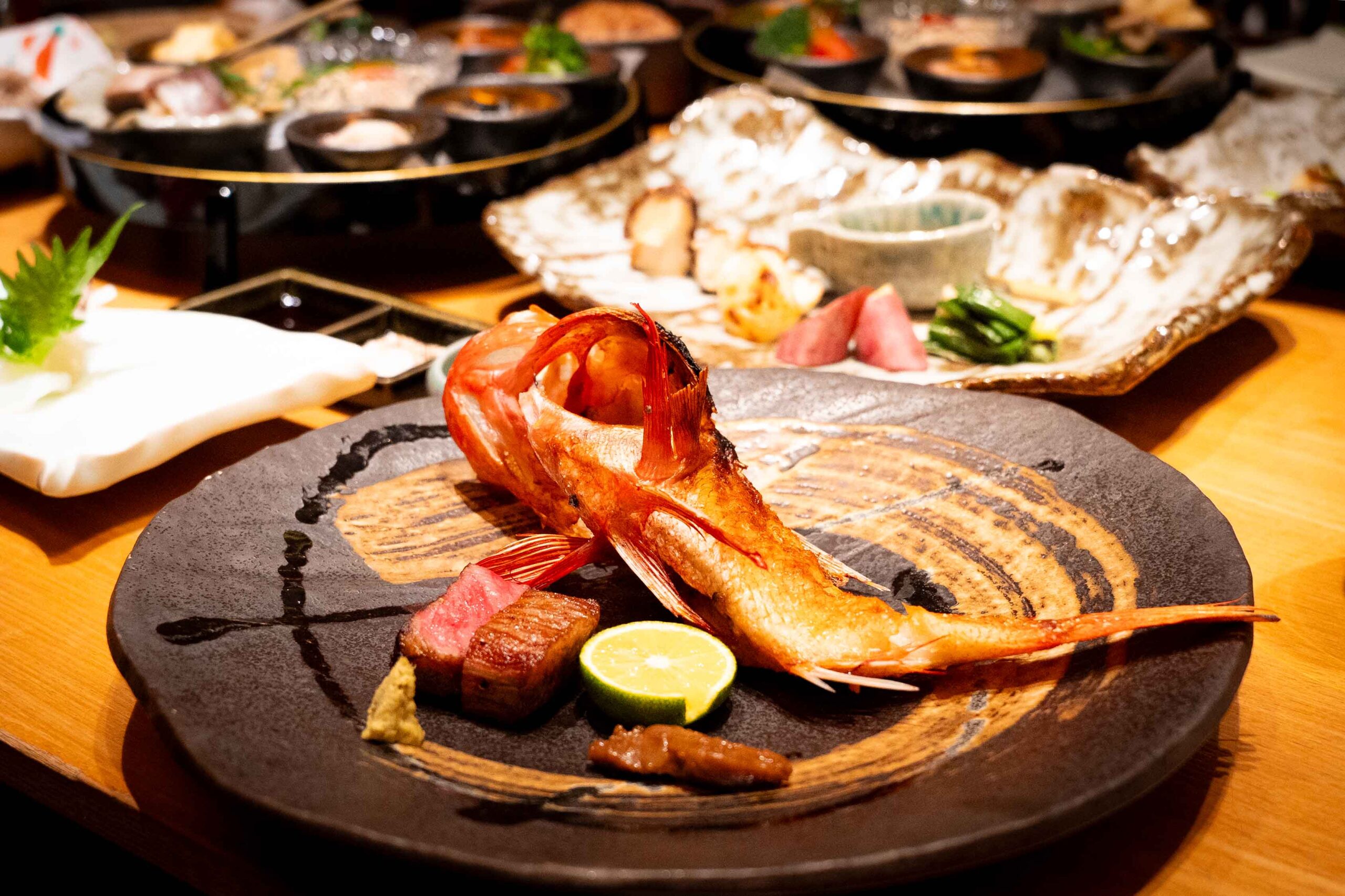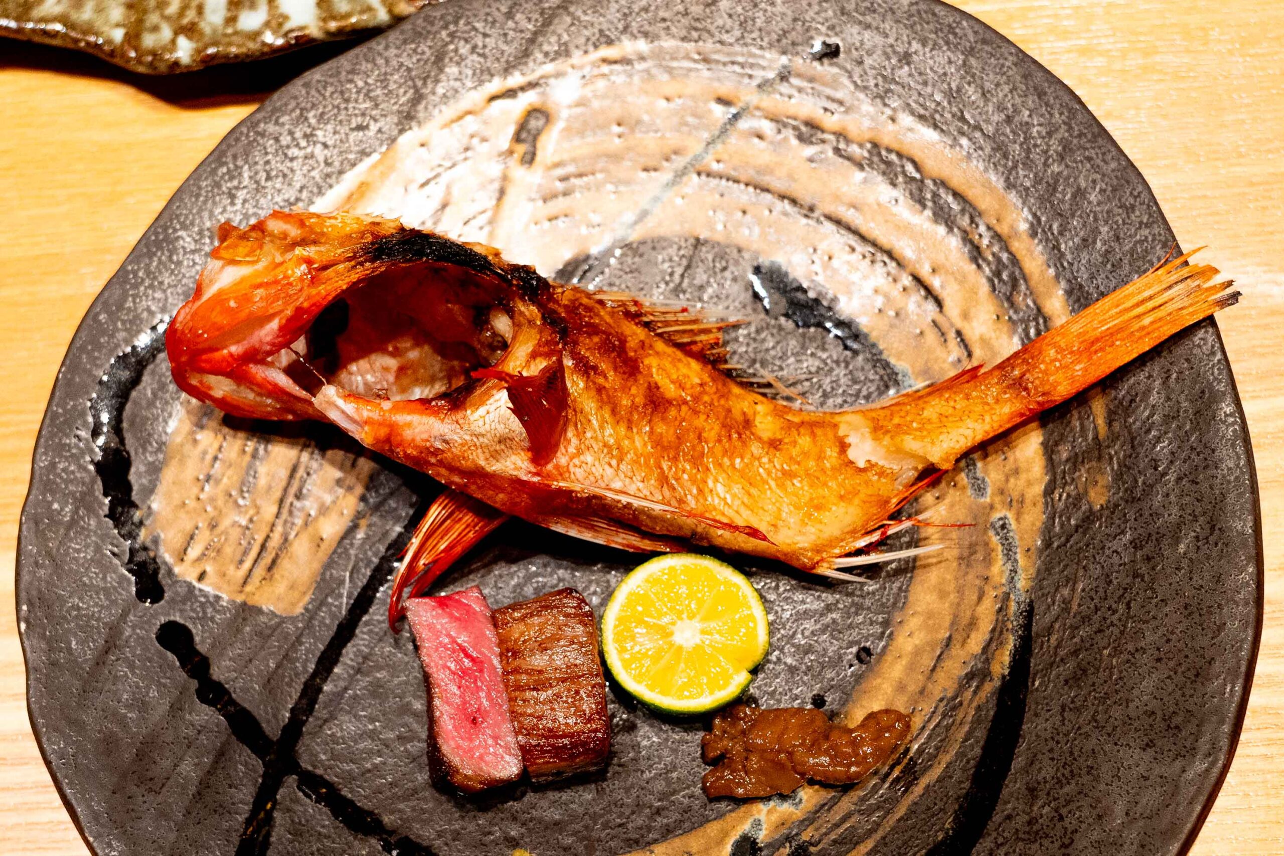 圧巻のメイン:原始焼き「きんき」と「和牛」