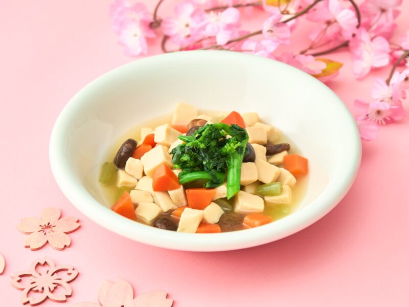 - 彩り高野豆腐春野菜添え:やさしい味わいの高野豆腐に旬の春野菜を添えた和メニュー 。