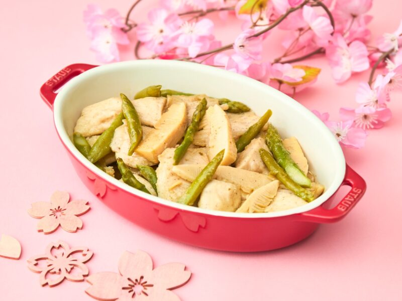 - 春野菜と若鶏の青じそ風味:青じその爽やかな香りが春らしい一皿 。